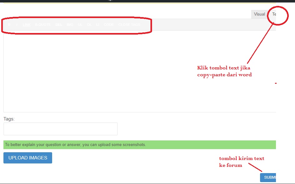 Dalam papan ketik topik maupun reply terdapat dua tombol di kanan atas yang punya fungsi berbeda. Tombol visual digunakan jika pengguna langsung mengetik ke ruang pengetikan. Tombol text digunakan jika pengguna menguasai bahasa program atau menggunakan aplikasi lain sebagai sumber text. Termasuk jika pengguna ingin menggunakan cara copy-paste dari ms word atau aplikasi dokumen lain seperti open office.